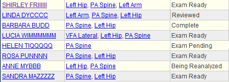 BoneStation also shows the workflow status of recent exams. The screen shot above demonstrates work to be done and where each exam is in the process. Each participant (technologist or reading physician) can then focus on their tasks in moving the exam through the process.